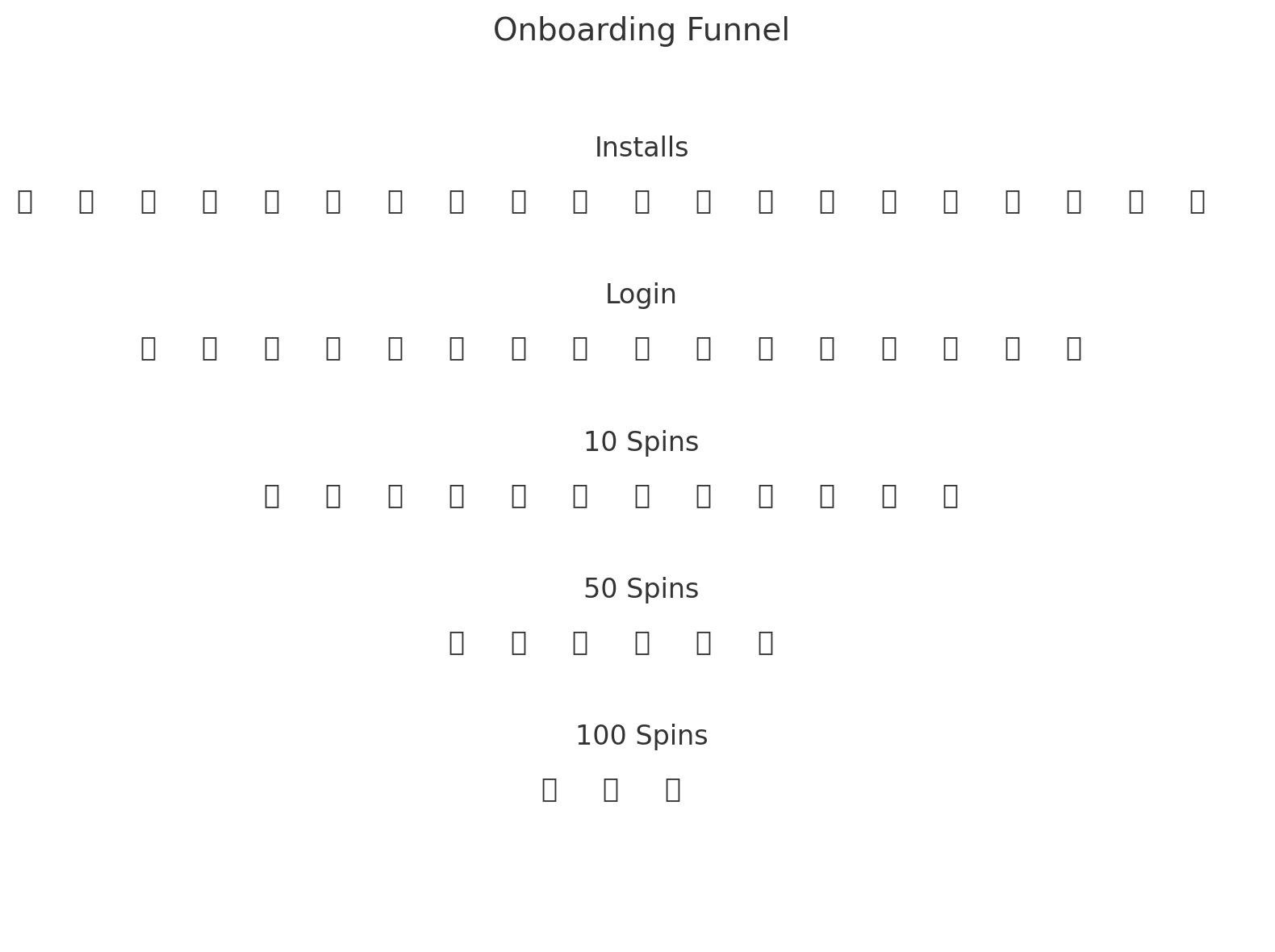 The typical funnel for a f2p slot would be the following. Our objective would send a maximum number of users on the last step, i.e. spinning 100 times. Research suggests that the first 5 to 10 minutes are crucial if you want to keep players coming back